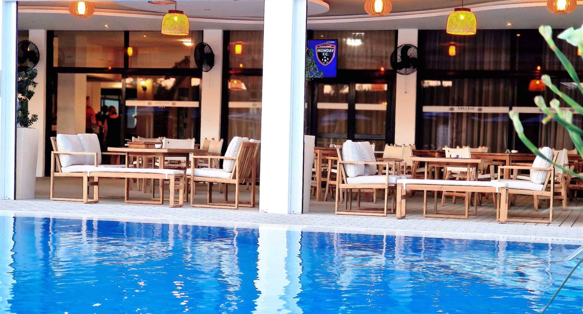 Hotel Sveltos*** posiada siłownię, duży basen rekreacyjny, Po wejściu do hotelu po l